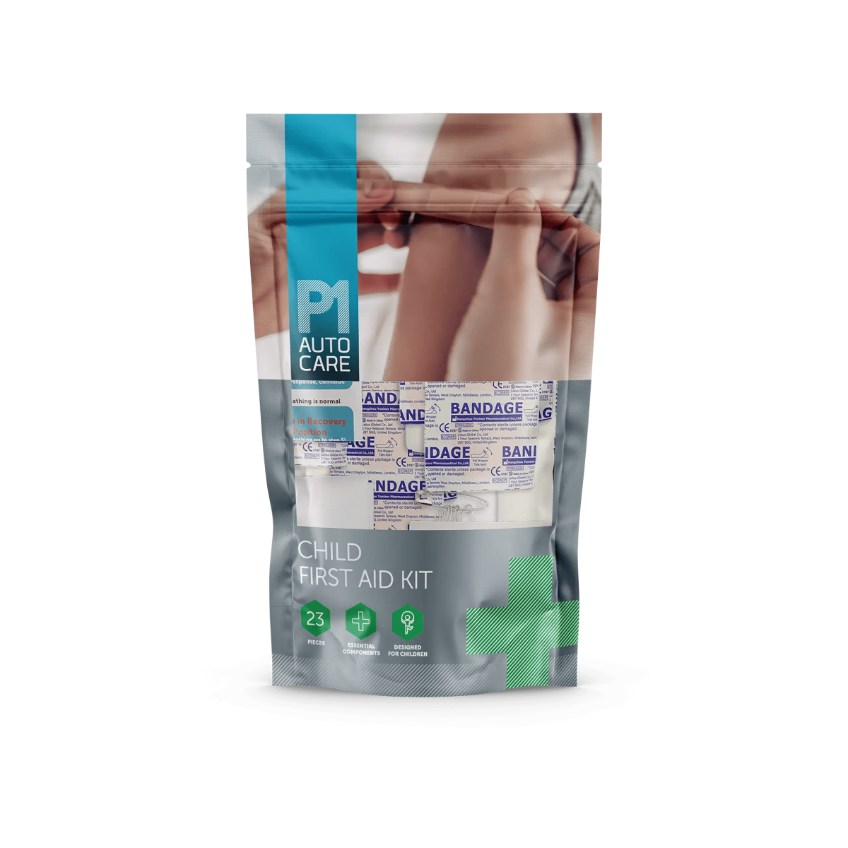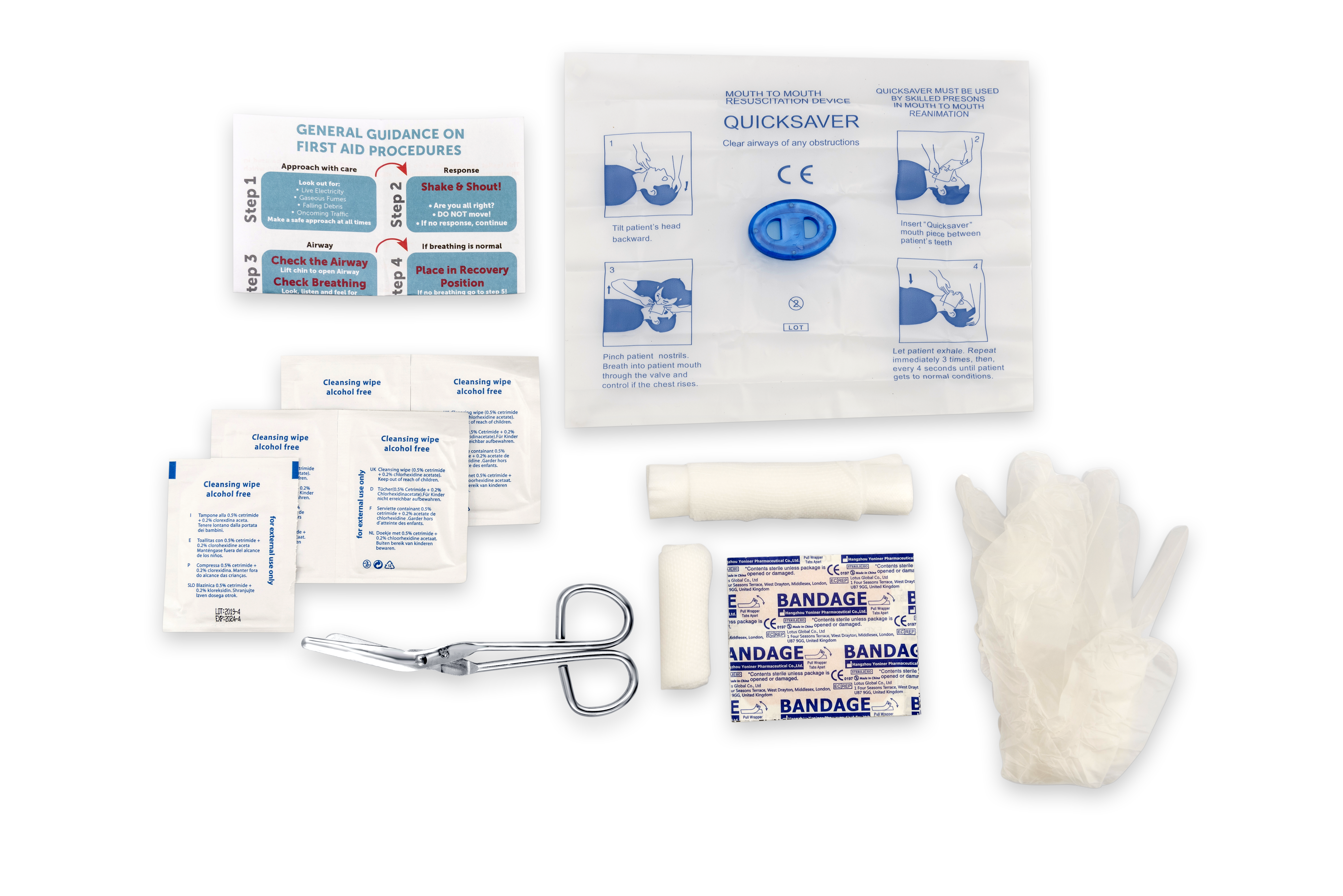 10x assorted Washproof plaster, 1x microporous tape, 2x cleansing wipe, 6x safety pin, 2x triangular bandage, 1x large dressing, 1x first aid guidance leaflet